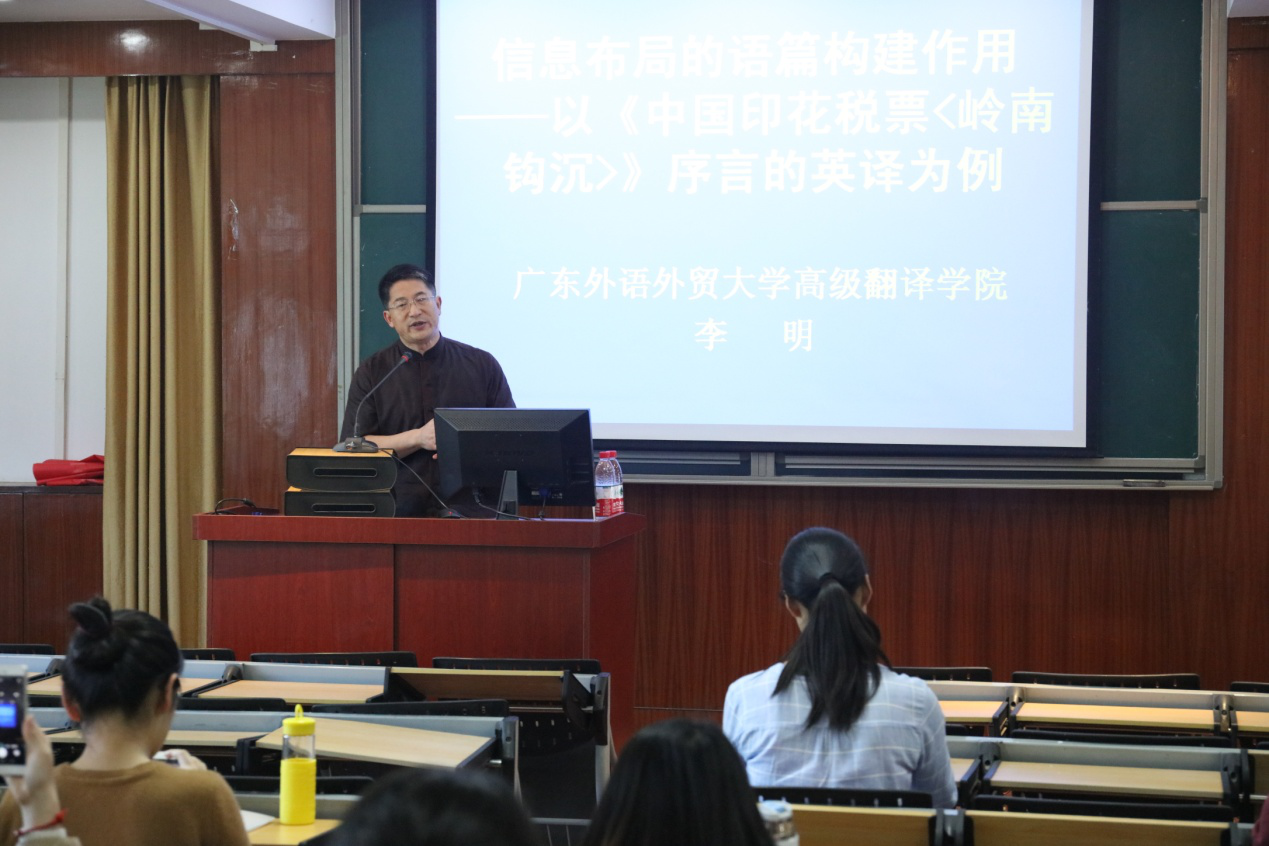 2017年4月27日下午,应华体会平台app邀请,广东外语外贸大学高级翻译学院副院长李明教授在3408报告厅作了一场题为“信息布局中的语篇构建作用—以《中国印花税票<岭南钩沉>》序言的英译为例”的学术讲座。李明教授的演讲主要包括三个部分。在第一部分,李教授详细介绍了信息布局理论中的前景信息和背景信息这两个概念,并对这两种信息的作用分别作了解释。在第二部分,李教授主要讲述了前景信息和背景信息的呈现方式。通过对比英汉两种语言中两种信息的不同呈现方式,提出要使译文符合译入语的语篇信息构建模式,并指出关键是要分清两种信息的主次,进行合理布局。在第三部分,李教授以自己翻译的《中国印花税票<岭南钩沉>》序言为例,详细介绍了对主要信息和次要信息的不同处理方法。