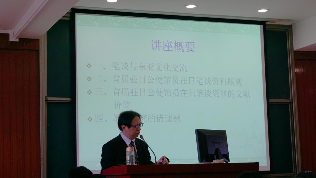 首先,李俄宪教授对刘雨珍教授的到来表示热烈的欢迎和诚挚的感谢,并介绍了刘教授的研究领域和诸多学术成就。刘教授从鉴真东渡的笔谈交流入手,分析至清代首届驻日公使馆员的笔谈资料,从地域的分布和历史的发展方面,对笔谈进行了详细解读。刘教授指出,笔谈研究能为我们打开更为广阔的学术视野,帮助我们在东亚的视域中研究中国。紧接着,刘教授展示了大量图文资料,生动再现了当时文人官员借助笔谈进行书道切磋、汉诗酬唱的场景。刘教授从白居易“香炉峰雪”的吟诵开始,生动地解析了东亚视域中的文化交流,以及中日文化相互影响,相互借鉴的过程,并分析了在这一东亚文化影响的环流中产生的诸多问题。随后,刘教授介绍了笔谈资料与当代其他史料互证的文献价值和当今笔谈研究的诸多课题。并回答了到场师生、学者提出关于中日关系走向等问题。 讲座过程中,刘教授列举大量第一手资料,吟诵中日诗赋,令到场听众深深折服。刘教授以其翔实的史料积累,开阔的学术视野和满溢的学术热情,介绍、讲解了东亚笔谈研究和文化交流,开拓了听众的视野,提供了“东方学”研究的新视点。听完刘教授讲座,李俄宪教授深为所动,当即高声吟唱:“公使浪人俱往矣,当今名士刘雨珍”,对刘教授的讲座给予了高度评价,并希望刘教授能再来华师指导我们的师生。同时以此次讲座为契机,我校与南开大学的友好关系和学术交流也得到了进一步的加强。讲座在热烈的掌声中圆满结束。