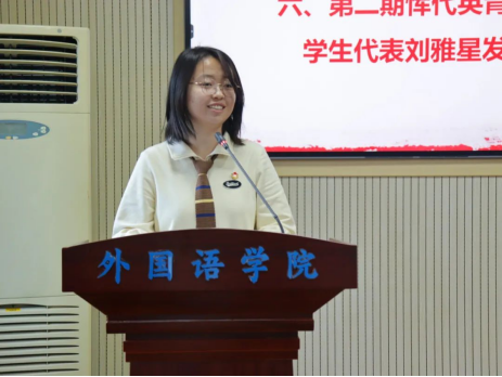 在第一期、第二期恽代英青苗班进行班旗交接仪式后,第二期恽代英青苗班学生代表刘雅星发言。她解释了自己选择加入青苗班的原因,并对寒假期间所开展的理论学习和实践活动有所感悟:“在这样一个充满机遇和挑战的时代,恽代英青苗班为青年学子们提供了学习与锻炼的平台。”最后,刘雅星对接下来的学习提出了展望,望学员们能将理论学习和实践锻炼有机结合,勤学善思,争做有理想、敢担当、能吃苦、肯奋斗的新时代好青年。