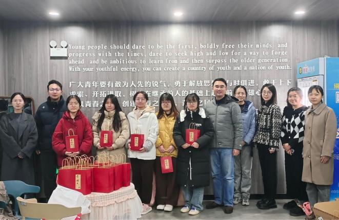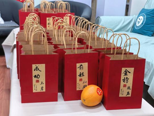 此次慰问活动中,学院还精心为考研学子准备了“考研暖心礼包”。2021级辅导员老师们与年级学生会干部前期进行了充分筹备,从物资的精心挑选到礼包的细心打包,每一步都凝聚着学院对同学们的深切期望与美好祝愿。礼包内不仅有寓意“心想事成”的甜橙,还有象征“事事如愿”的薯愿等小礼品,虽小巧却情谊深重,传递着学院对同学们的美好期盼。老师们在逐一走访考研同学的寝室过程中,亲手送上这份满载心意的礼包与真挚的祝福。
