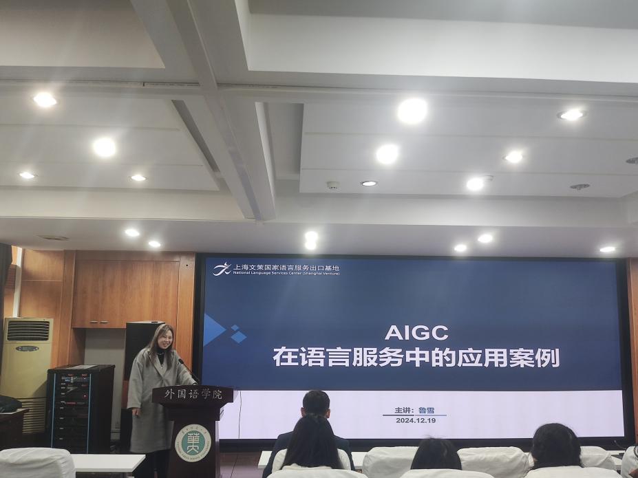 在人工智能技术飞速发展的今天,翻译行业正经历着前所未有的变革。为使我院学生更好地理解这一变革并把握未来职业发展的方向,我院于2024年12月19日下午举办了一场主题为“AIGC在语言服务中的应用案例”的行业前沿讲座。本场讲座由上海文策国家语言服务出口基地的高级培训师、翻译项目经理鲁雪女士主讲,她以其丰富的行业经验和独到的见解,为在座师生带来了一场思想的盛宴。讲座吸引了多位翻译方向教师和2024级MTI研究生参加。学院党委副书记罗舰莅临现场指导。MTI教育中心覃江华教授主持讲座。
