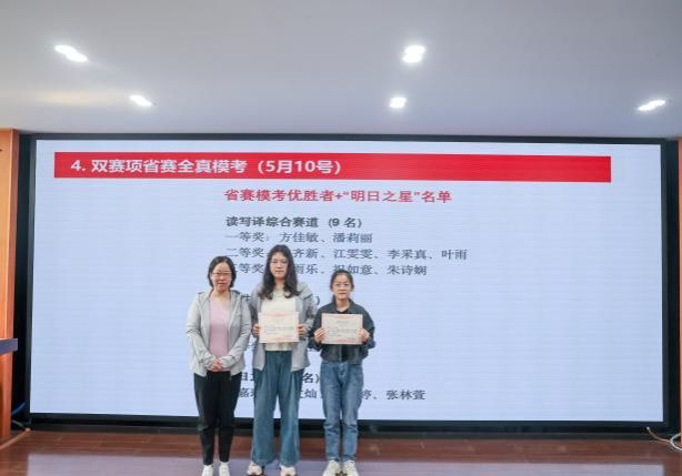 随后,备赛训练营的指导教师们为在备赛过程中积极分享经验的“朋辈导师”,在读写译、演讲等赛道省赛全真模拟考中表现优异的“省赛模考优胜者”,以及积极参与训练营活动且极具潜力的“明日之星”颁发荣誉证书,以此激励同学们在后续备赛中持续奋进,不断突破自我。
