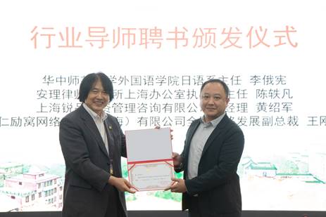 仪式现场,校党委副书记陈迪明和华体会平台app党委副书记陈哲为长谷川由树、张凯颁发荣誉证书。副院长王佳和日语系主任李俄宪为黄绍军、陈轶凡、王刚颁发行业导师聘书。