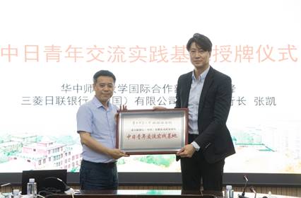 华中师范大学国际合作部部长洪峰与三菱日联银行武汉分行行长张凯共同为“中日青年交流实践基地”揭牌。该基地将聚焦中日青年文化交流与能力培养,依托学校日语学科优势及日企资源,定期开展语言实践、文化研学、职业发展等活动。