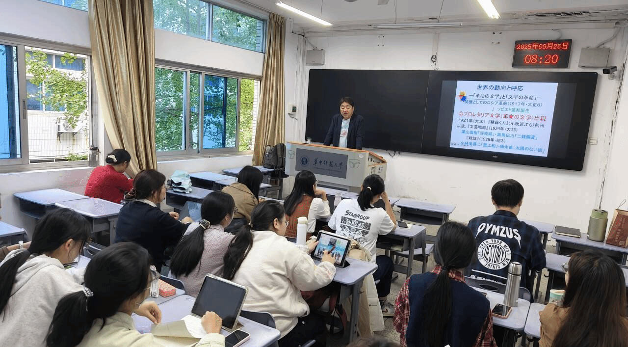 9月23日至9月26日,大井田教授为日语系研究生连续开展六场集中讲义,以“日本近代文学简史——从春树到HARUKI”为主题,系统阐释日本近代文学的发展脉络。讲义中,大井田教授提出“日本近代文学始于岛崎藤村,终于村上春树或迈向新阶段”的文学史观,围绕二叶亭四迷、横光利一、松本清张等关键作家及其代表作,结合具体的文本分析文学流变的阶段性特征与内在逻辑。其讲解史料详实、逻辑清晰,为在座师生构建了完整的文学史认知框架。并在集中讲义之后,专门设置了观影时间,重点为同学们介绍了日本自然主义代表作家岛崎藤村的作品《破戒》,并与同学们共同观赏以上述作品为原型拍摄的影片,观影结束后与同学们就此作品进行了热烈讨论。
