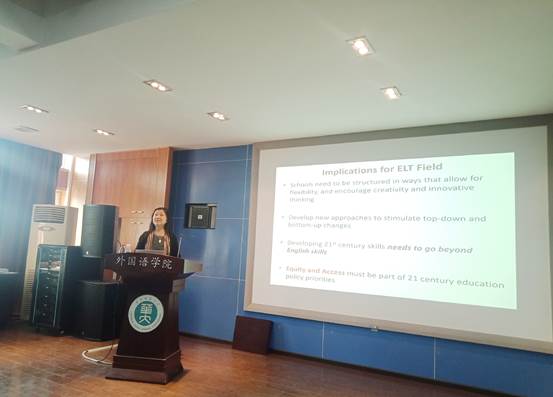在第二场讲座中,孙教授首先向大家介绍了21世纪全球化环境下所需的4大类技能以及对英语语言教学的启示,然后强调了教育公平的重要性和范式转换。接下来孙教授为大家介绍了TESOL的六大原则。最后她结合研究实例为大家介绍创新型项目TILT(Transparency in Learning and Teaching),并指出在21世纪学习是创新型教育,要缩短教育差距,帮助所有学生走向成功。