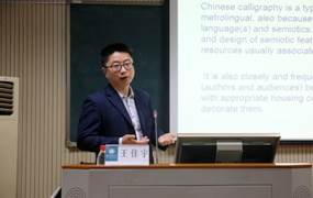 第七场报告是“Chronotopic Identities in Chinese Poetry Calligraphy as Metrolingual Text Art”。华体会平台app王佳宇教授从社会语言学的视角,分析了不同书法爱好者的书法作品《相见欢》,这些书法作品被视作城市语言学语篇。诗歌作者基于特定的主题进行创作,从而构建一种身份;书法创作者根据自己对诗歌的理解,在创作书法作品时抒发自身的情感,也构建了一种身份。王佳宇教授探讨了这些跨越不同时空的身份如何在书法作品中共存、融合及竞争。