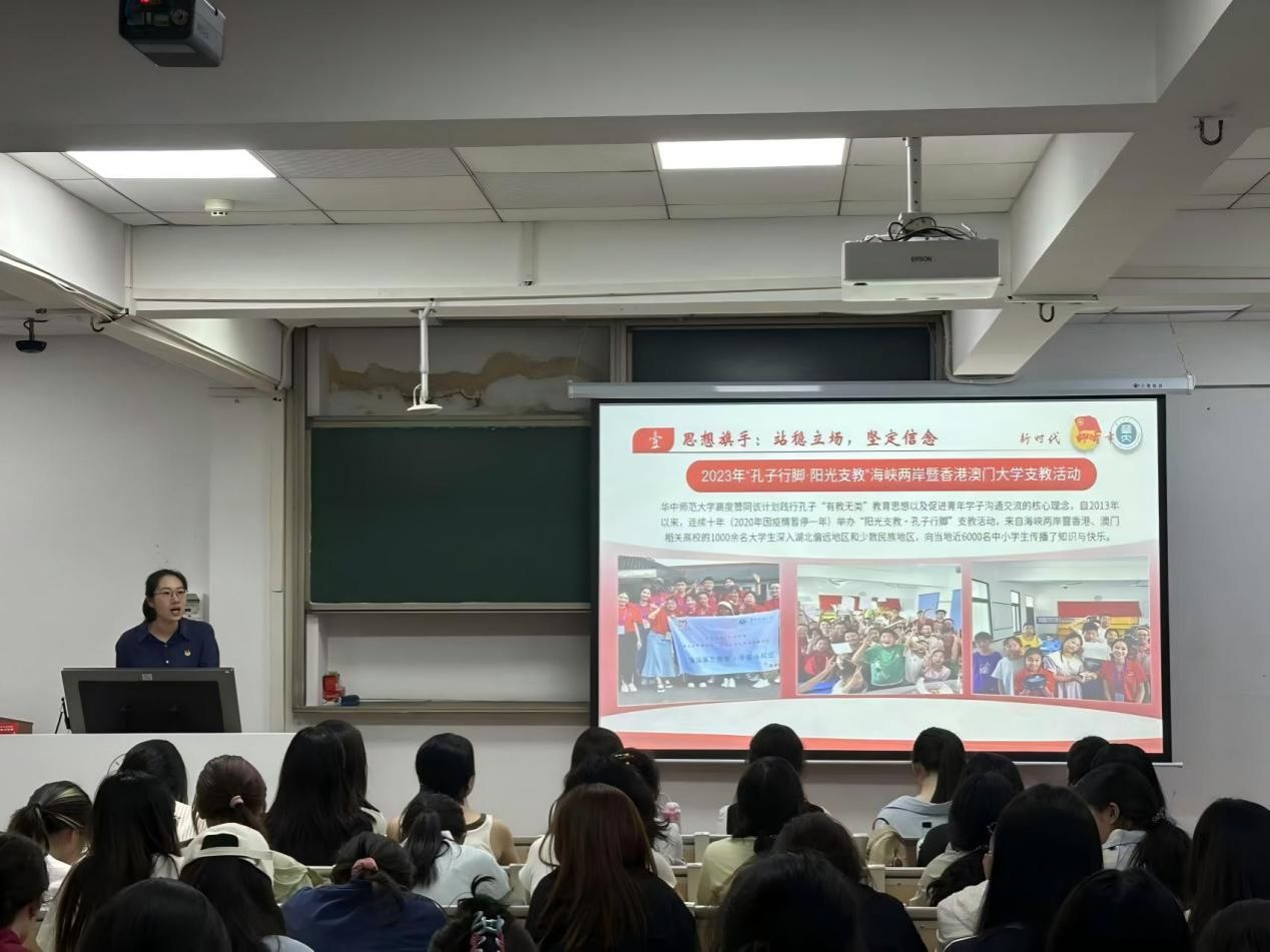2021级英语(师范)专业本科生邬丽婷为2024级小语种青年学子讲授“胸怀理想,筑梦远航”主题团课。她以章开沅老校长题写的“语言大师,思想旗手,行动先锋”为主线,从思想淬炼、专业筑基、全球实践三个维度展开讲述。邬丽婷向大家分享作为第十四届MODEL APEC大会全国总冠军,受邀以中国青年代表身份参加APEC 工商领导人峰会的经历,生动诠释了外语人才在文明互鉴中的桥梁作用,强调“语言能力是新时代青年对话世界的通行证”,为外院青年学子指明了“扎根中国、放眼全球” 的成长路径。