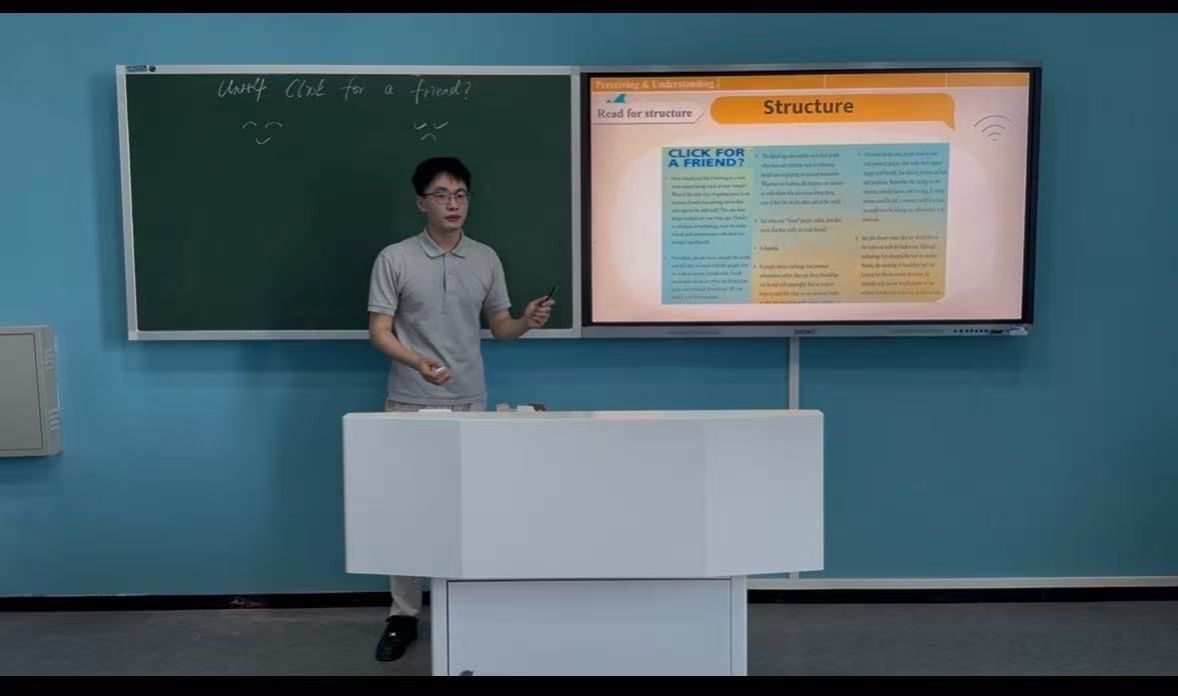 本届决赛设置模拟授课与现场答辩两大核心环节,对选手的综合能力提出了极高要求。比赛全程采用无网络环境备课,选手需在90分钟内完成课件制作,随后进行10分钟的模拟授课展示,最后接受3分钟的现场答辩考核。竞赛所用教学材料均选自国内通用高中英语教材必修模块的单元内容,确保了考核的专业性与实用性。比赛现场,我院三名学子自信从容、仪态大方,充分彰显了华中师范大学教育硕士的优良精神风貌。在授课展示中,选手们格外注重导入环节的情境创设,通过兼具真实性与趣味性的设计快速吸引“学生”注意力。授课过程中,他们灵活运用多样化教学方法,结合细致深入的引导互动,将“以学生为中心”的教育理念落到实处。同时,选手们以学科核心素养培养目标为导向,在学习活动观指引下,不仅清晰梳理了文本核心内容,更在单元大观念的构建过程中,有效锻炼了学生的逻辑思维品质,融入了品格教育内涵,课堂教学成效得到了充分展现,赢得了评委的认可。